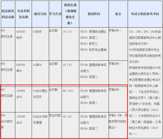 2018年上海國(guó)家會(huì)計(jì)學(xué)院MPAcc有全日制和非全日制兩種類型,全日制招生80人,擬接收推免生數(shù)16人,學(xué)制2年;非全日制招生40人,學(xué)制2.5年,錄取類別為定向就業(yè)。