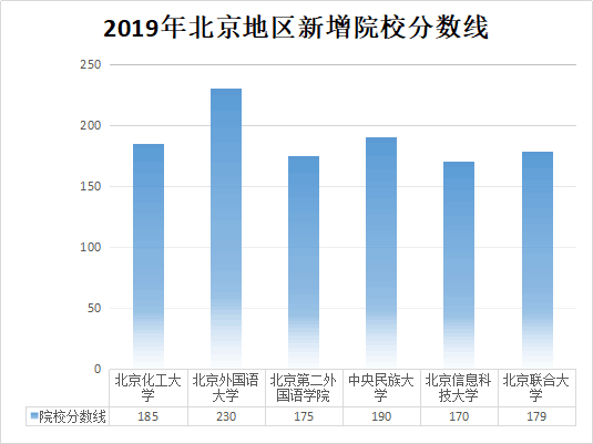 如圖2-1所示: 2019年北京地區(qū)新增6所院校,院校分?jǐn)?shù)線平均分約為188分。