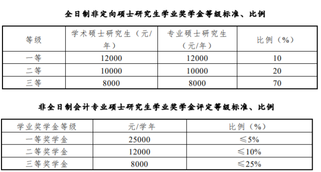 (二)獎(jiǎng)學(xué)金:為支持碩士研究生完成學(xué)業(yè),完善碩士研究生教育保障和激勵(lì)機(jī)制,吸引優(yōu)質(zhì)生源,調(diào)動(dòng)學(xué)生參與科學(xué)研究和社會(huì)實(shí)踐的積極性,我院設(shè)立了學(xué)業(yè)獎(jiǎng)助學(xué)金制度。全日制學(xué)業(yè)獎(jiǎng)學(xué)金評(píng)定按本院《研究生學(xué)業(yè)獎(jiǎng)學(xué)金管理暫行辦法》《研究生學(xué)業(yè)獎(jiǎng)學(xué)金綜合測(cè)評(píng)實(shí)施細(xì)則》的制度執(zhí)行。非全日制會(huì)計(jì)專業(yè)學(xué)位碩士研究生學(xué)業(yè)獎(jiǎng)學(xué)金評(píng)定按本院《非全日制會(huì)計(jì)專業(yè)學(xué)位碩士研究生學(xué)業(yè)獎(jiǎng)學(xué)金評(píng)定細(xì)則(試行)》執(zhí)行,獎(jiǎng)學(xué)金的等級(jí)設(shè)定、標(biāo)準(zhǔn)及比例見(jiàn)下表。