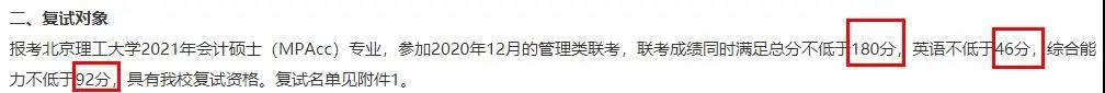 北京理工大學2021年會計專碩復試分數線為180/92/46