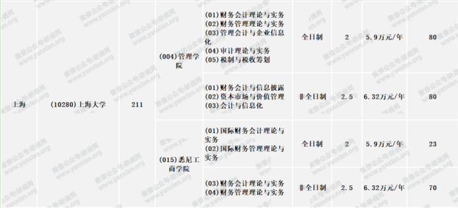 上海大學全日制會計專碩學制學費:學制為2年,2020年學費為5.9萬元/年;非全日制會計專碩學制學費:學制為2.5年,2020年學費為6.32萬元/年