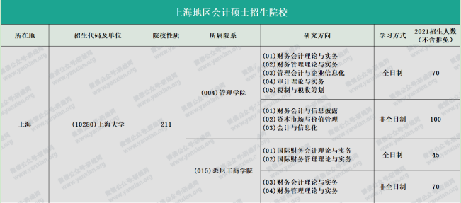 上海大學2021年管理學院全日制會計專碩計劃招生70人(不含推免)非全日制會計專碩計劃招生100人