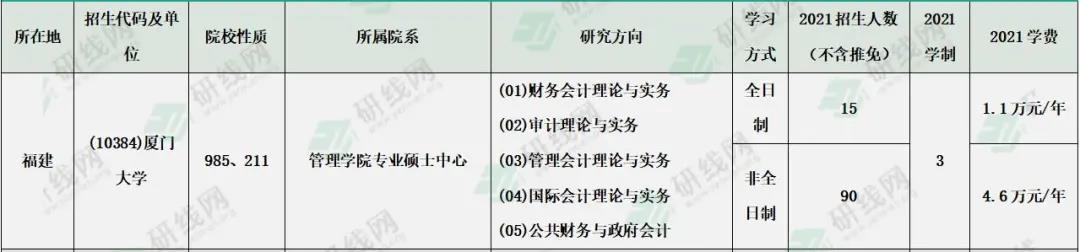 廈門大學2021年全日制會計專碩學制學費:學制為3年,學費為1.1萬元/年,非全日制會計專碩學制學費:學制為3年,學費為4.6萬元/年