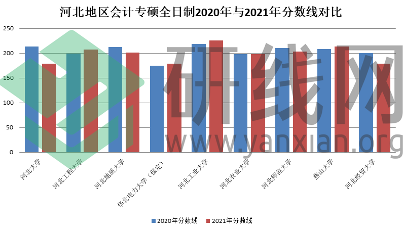 河北地區會計專碩全日制2020年與2021年復試分數線對比如下: