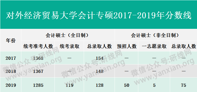 2019年對外經(jīng)濟貿(mào)易大學(xué)會計碩士(全日制)專業(yè)統(tǒng)考準考人數(shù)1285名,統(tǒng)考錄取人數(shù)119名;會計碩士(非全日制)專業(yè)一志愿錄取人數(shù)5名,錄取人數(shù)75名。