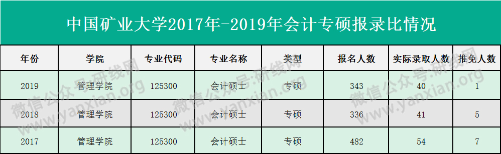 2017年中國礦業大學會計專碩報考人數482名,錄取人數54名,推免人數7名。