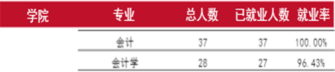 截止2019年11月25日,碩士研究生落實就業去向1759人,就業率為98.88%,其中國內升學26人(1.46%),國外(境)留學22人,簽協議(合同)1568(88.14%),靈活就業136人(7.64%),自主創業6人(0.34%),國際組織1人(0.01%)。其中會計碩士研究生畢業生總數為236人,簽訂合同220人,靈活就業10人,專業就業率100%。