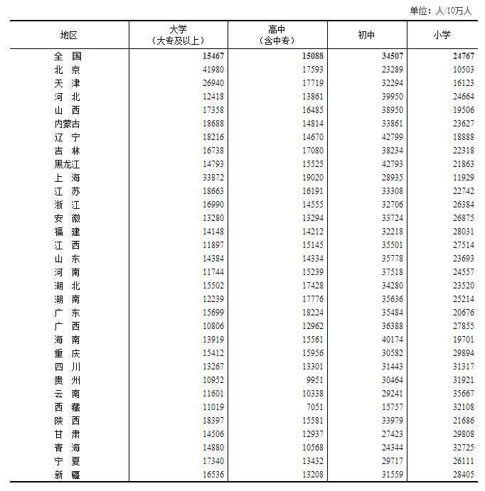 根據第七次全國人口普查結果,現將2020年11月1日零時我國大陸31個省、自治區、直轄市(以下簡稱省份)和現役軍人的人口受教育基本情況公布如下: