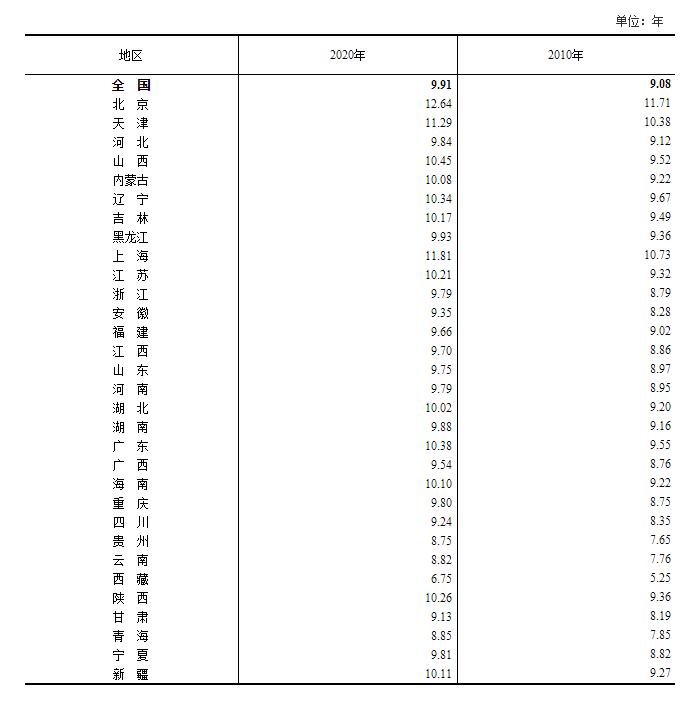 與2010年第六次全國人口普查相比,全國人口中,15歲及以上人口的平均受教育年限由9.08年提高至9.91年。