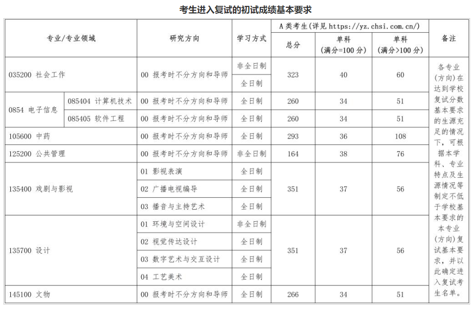 根據教育部公布的《2025年全國碩士研究生招生考試考生進入復試的初試成績基本要求》,我校社會工作碩士、電子信息碩士、中藥碩士、公共管理碩士、戲劇與影視碩土、設計碩士及文物碩士,均以此要求中A類考生的總分及單科成績要求為基準來確定考生進入我校復試的基本成績要求及復試名單。報考同一專業的全日制學習方式考生和非全日制學習方式考生成績要求相同。考生進入我校復試基本成績要求見下表:
