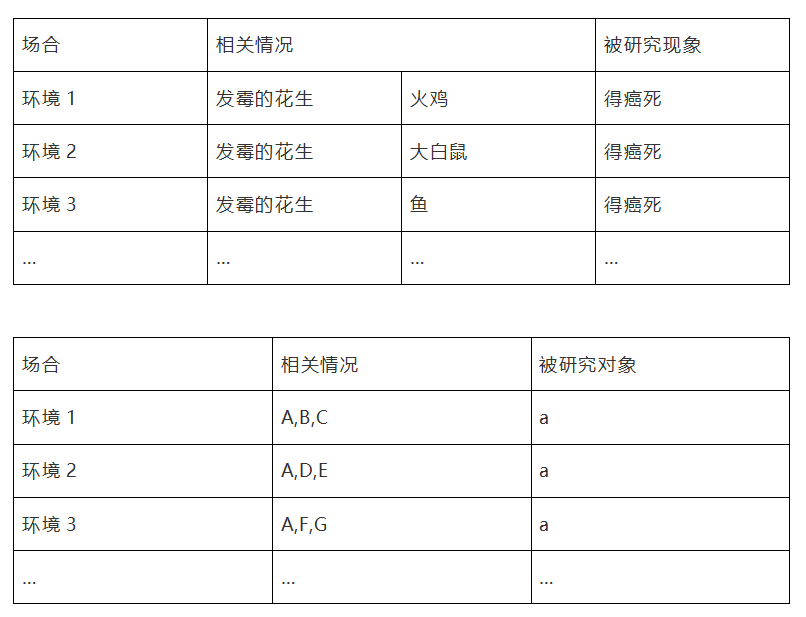 1960年,英國某農(nóng)場(chǎng)十萬只火雞和小鴨吃了發(fā)霉的花生,在幾個(gè)月內(nèi)得癌癥死了。后來,用這種花生喂羊、貓、鴿子等動(dòng)物,又發(fā)生了同樣的結(jié)果。1963年,有人又用發(fā)了霉的花生喂大白鼠、魚和雪貂,也都紛紛得癌而死,上述各種動(dòng)物患癌癥的前提條件中,對(duì)象、時(shí)間、環(huán)境都不同,唯一共同的因素就是吃了發(fā)霉的花生。于是,人們推斷:吃了發(fā)霉的花生可能是這些動(dòng)物得癌死亡的原因。后來通過化驗(yàn)證明,發(fā)霉的花生內(nèi)含黃曲霉素,黃曲霉素是致癌物質(zhì)。這就是“求同”。