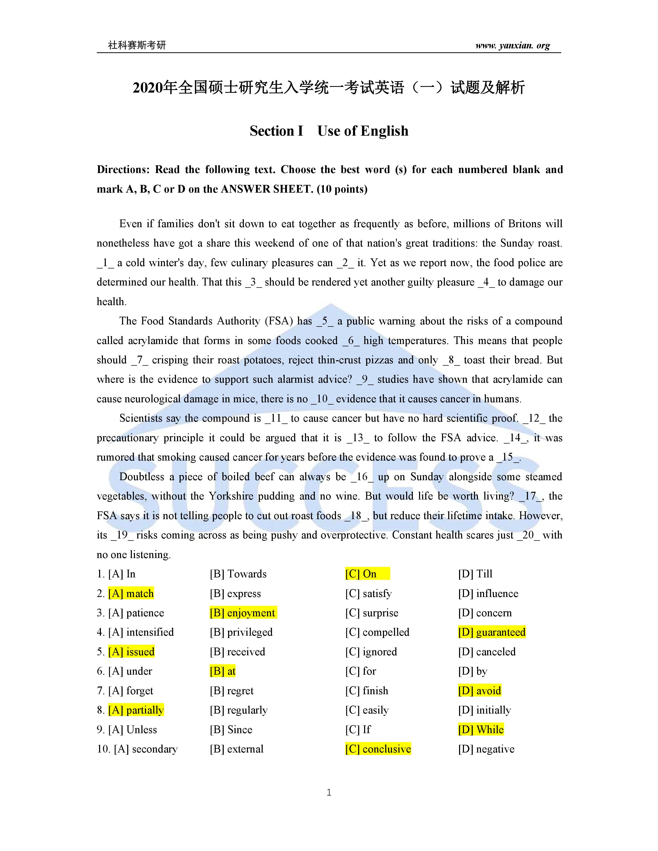 2020年全國碩士研究生考試考研英語(一)真題及解析