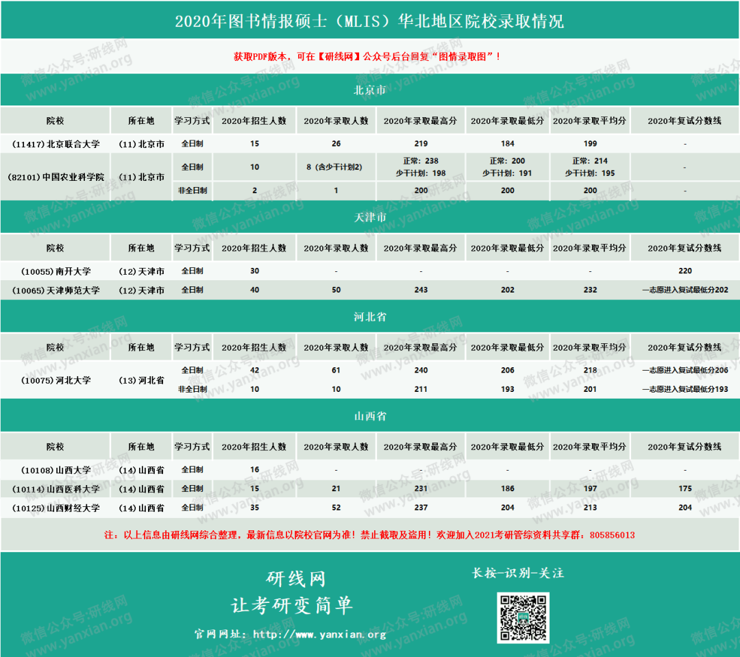 2021圖書情報(bào)擇校:【華北地區(qū)】圖書情報(bào)2020年院校錄取情況