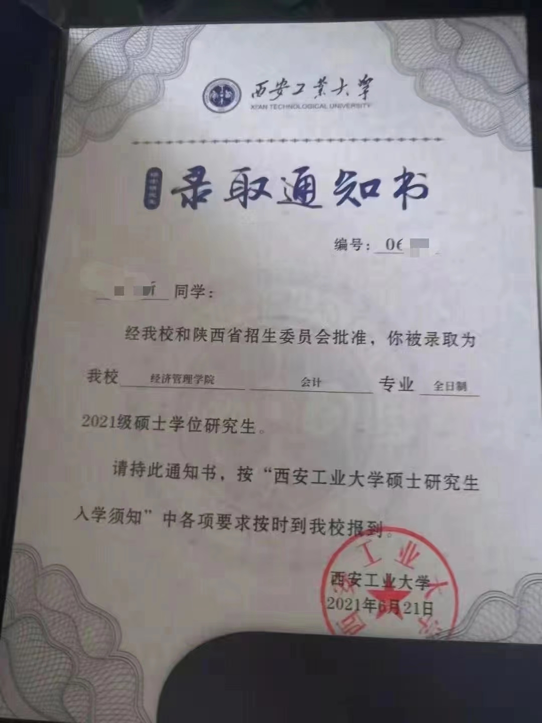 西安工業(yè)大學(xué)碩士研究生錄取通知書