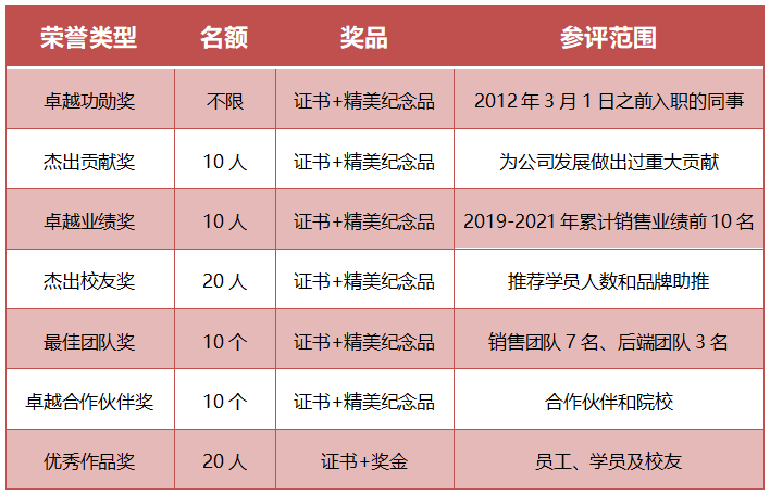 (1)最佳團隊獎面向全體部門及分校。其中業務部門要求2021全年銷售業績排名前七名;非業務部門要求為公司發展做出突出貢獻并得到大家認可。