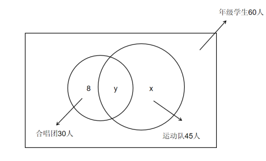 在圖形外邊引出一個(gè)箭頭的,表示這個(gè)圖形的整個(gè)數(shù)量。比如這整個(gè)正方形的總?cè)藬?shù)是60人,整個(gè)合唱團(tuán)的完整的圓,總?cè)藬?shù)是30人,整個(gè)運(yùn)動(dòng)隊(duì)的完整的圓,總?cè)藬?shù)是45人。8,x,y分別就代表了他們所在的封閉圖形的人數(shù)。比如y就代表兩個(gè)圓中間相交部分的人數(shù)。