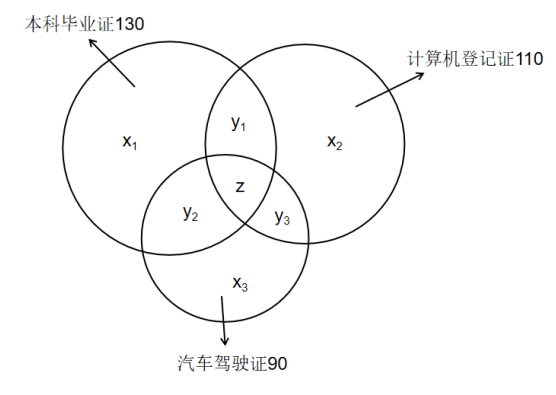 我們用x1、x2、x3來(lái)表示只考了一個(gè)證件的人(哼!學(xué)渣!學(xué)酥!學(xué)粉!學(xué)末!學(xué)灰!)。用y1、y2、y3來(lái)表示考了兩個(gè)證件的人(妥妥的學(xué)霸啊!)。用z來(lái)表示考了三個(gè)證件的人(學(xué)神,對(duì)我發(fā)誓,一定要說(shuō)是李老師我教出來(lái)的啊!)。
