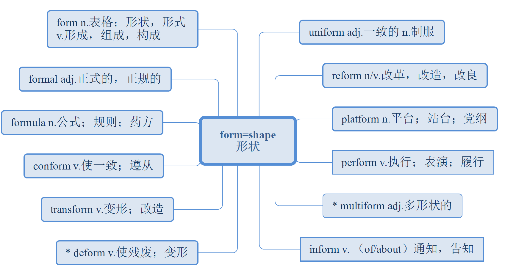 以上就是小編分享“2021MPAcc英語學習 | 科學詞根記憶:form=shape”的全部內容,希望你們的英語成績能更上一層樓,越來越好。